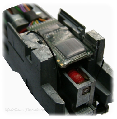 Rimontare i carrelli, ed alloggiare il decoder nella sede creata, raccogliendo i fili utilizzando un pezzo di tubo termorestringente. I fili dovranno passare in mezzo alle due lamelle di contatto del motore.
