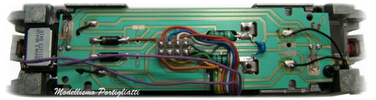 Vista d'insieme del cablaggio ultimato. Con un pezzo di bi-adesivo, è possibile fermare i cavi del decoder nel punto come in foto, in modo tale che non si vedano attraverso i finestrini del corridoio, una volta richiusa la cassa. La sistemazione dei componenti in questo modo permette di mantenere tutti gli elementi funzionali, quali il circuito stampato (con la lieve modifica descritta) e le guide luce, permettendo di richiudere la cassa senza sforzare.