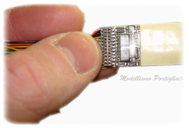 Attaccare il decoder sotto il circuito stampato, dopo aver preventivamente pulito con un po' di alcol possibili tracce di grasso. Sistemare il decoder non perfettamente in centro, ma piu' spostato verso un lato, come da foto. Prima di premere completamente per una buona presa del bi-adesivo, verificare che il circuito stampato possa essere nuovamente inserito nella sua sede, senza interferenze ed eventualmente riposizionare il decoder.