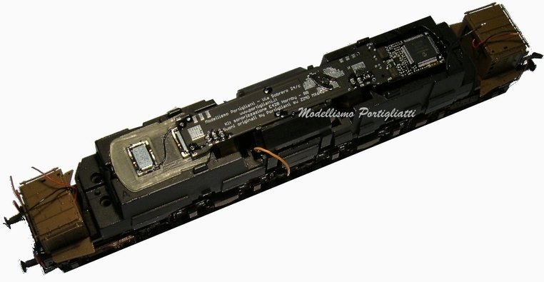 Con l'aiuto di mio fratello Marco, specializzato in modellazione CAD 3-D, è stato realizzato un apposito altoparlante per questi modelli, la cui forma segue esattamente l'interno del telaio dell' E428 Rivarossi - Hornby/RR, massimizzando il volume della cassa di risonanza, senza interferire con le parti in movimento (carrello, giunto cardanico).