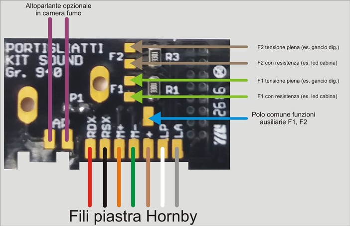 - dissaldare i fili dalla piastra originale Hornby e saldarli nella stessa sequenza sul nostro Kit (rotaia destra, rotaia sinistra, motore +, motore - , positivo comune, luce posteriore, luce anteriore).