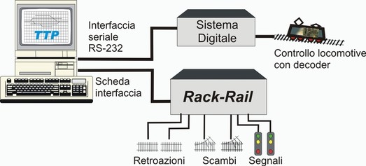 Si pensò dunque di utilizzare i sistemi digitali per il solo interfacciamento dei mezzi, mentre nacque parallelamente l’idea di affiancare al software TTP il sistema Rack-Rail, che consentiva di azionare scambi/segnali e di rilevare le posizioni dei convogli sul plastico direttamente dal PC, indipendentemente dal sistema digitale utilizzato.