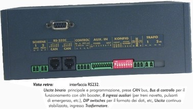- uscite separate per binario principale e per binario di programmazione decoder; l'uscita per il binario di programmazione ha potenza elevata (3 A) sufficiente per testare il completo funzionamento delle locomotive anche nelle scale grandi